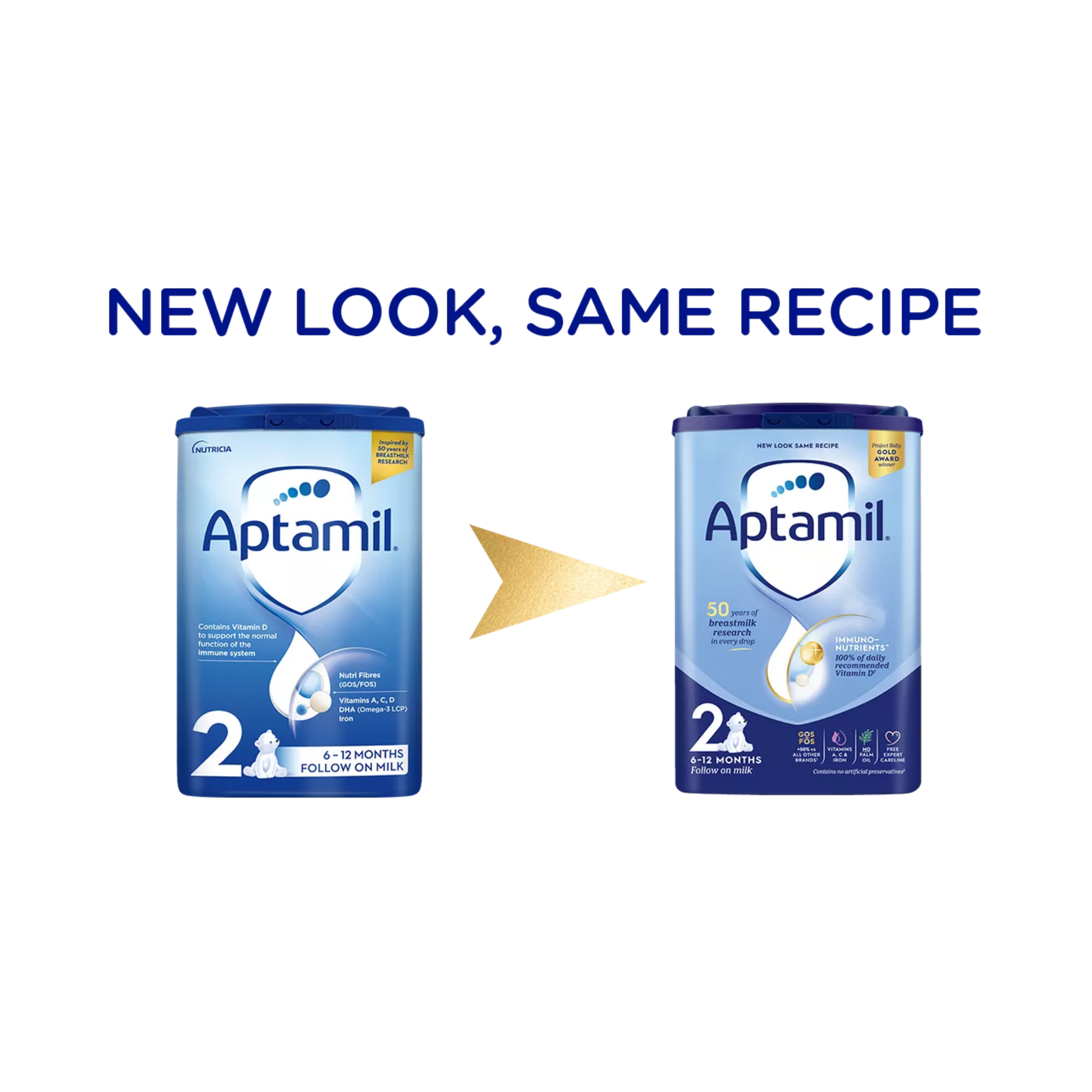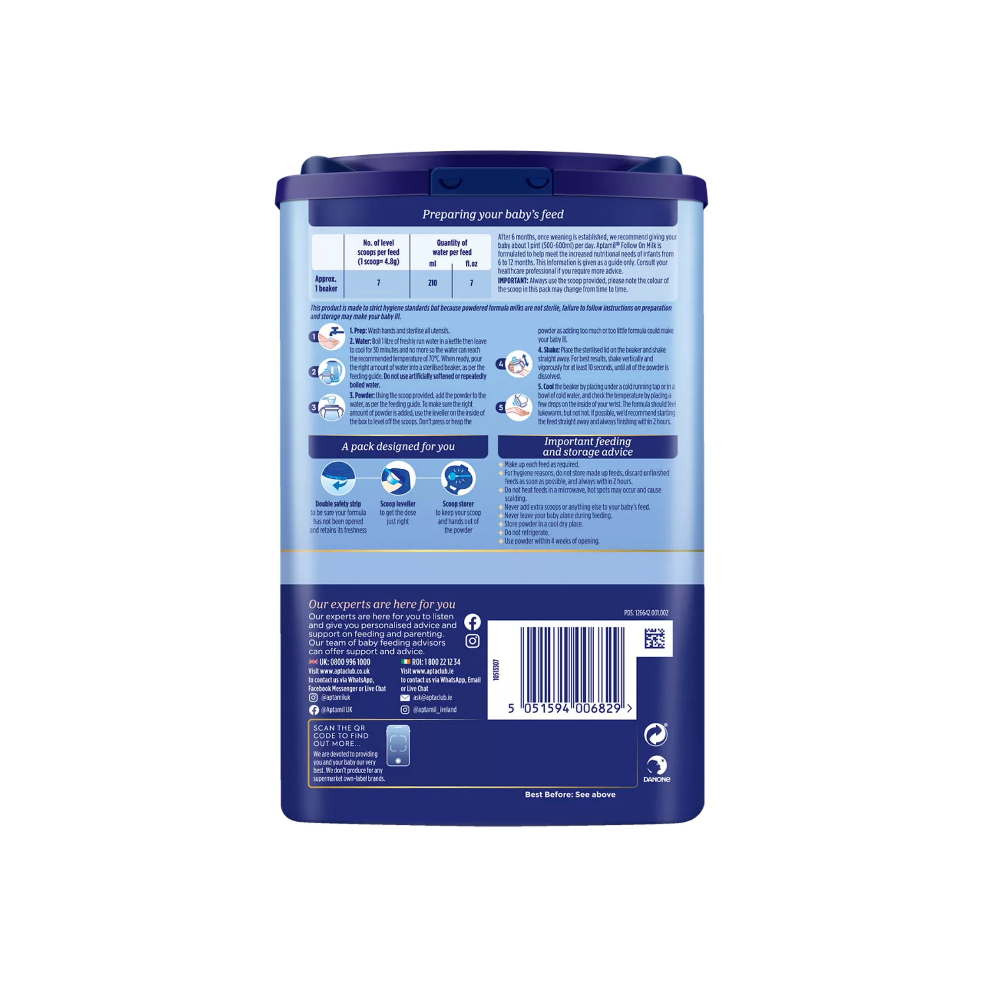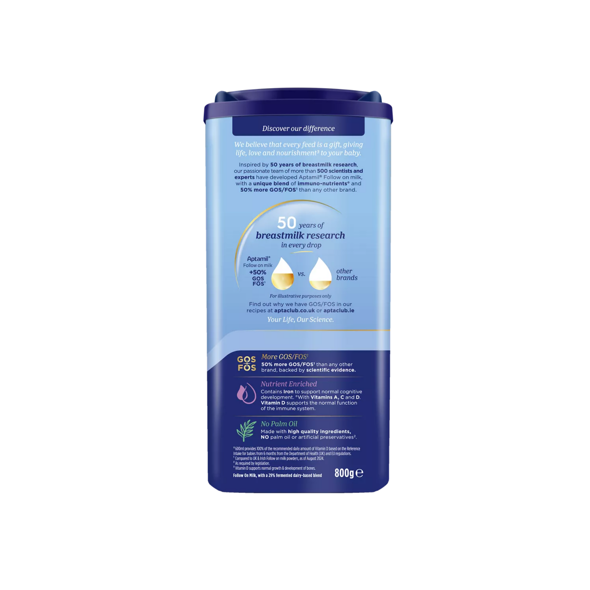 Dairy-based blend (of which 29% is fermented) [Lactose (from milk), Vegetable oils (High oleic sunflower oil, Coconut oil, Rapeseed oil, Sunflower oil), Skimmed milk, Demineralised whey (from milk), Whey concentrate (from milk), Calcium phosphate, Fish oil, Potassium chloride, Potassium citrate, Choline chloride, Sodium citrate, Vitamin C, Calcium carbonate, Emulsifier (Soy lecithin), Inositol, Magnesium chloride, Vitamin E, Antioxidant (Vitamin C), Pantothenic acid, Nicotinamide, Thiamin, Riboflavin, Vitamin B6, Folic acid, Potassium iodide, Vitamin K1, Biotin, Vitamin B12], Galacto-oligosaccharides (GOS) (from milk), Fructo-oligosaccharides (FOS), Milk protein, Magnesium hydrogen phosphate, Oil from Mortierella Alpina, Sodium chloride, L-Tryptophan, Ferrous sulphate, Zinc sulphate, L-Carnitine, Copper sulphate, Vitamin A, Manganese sulphate, Sodium selenite, Vitamin D3.