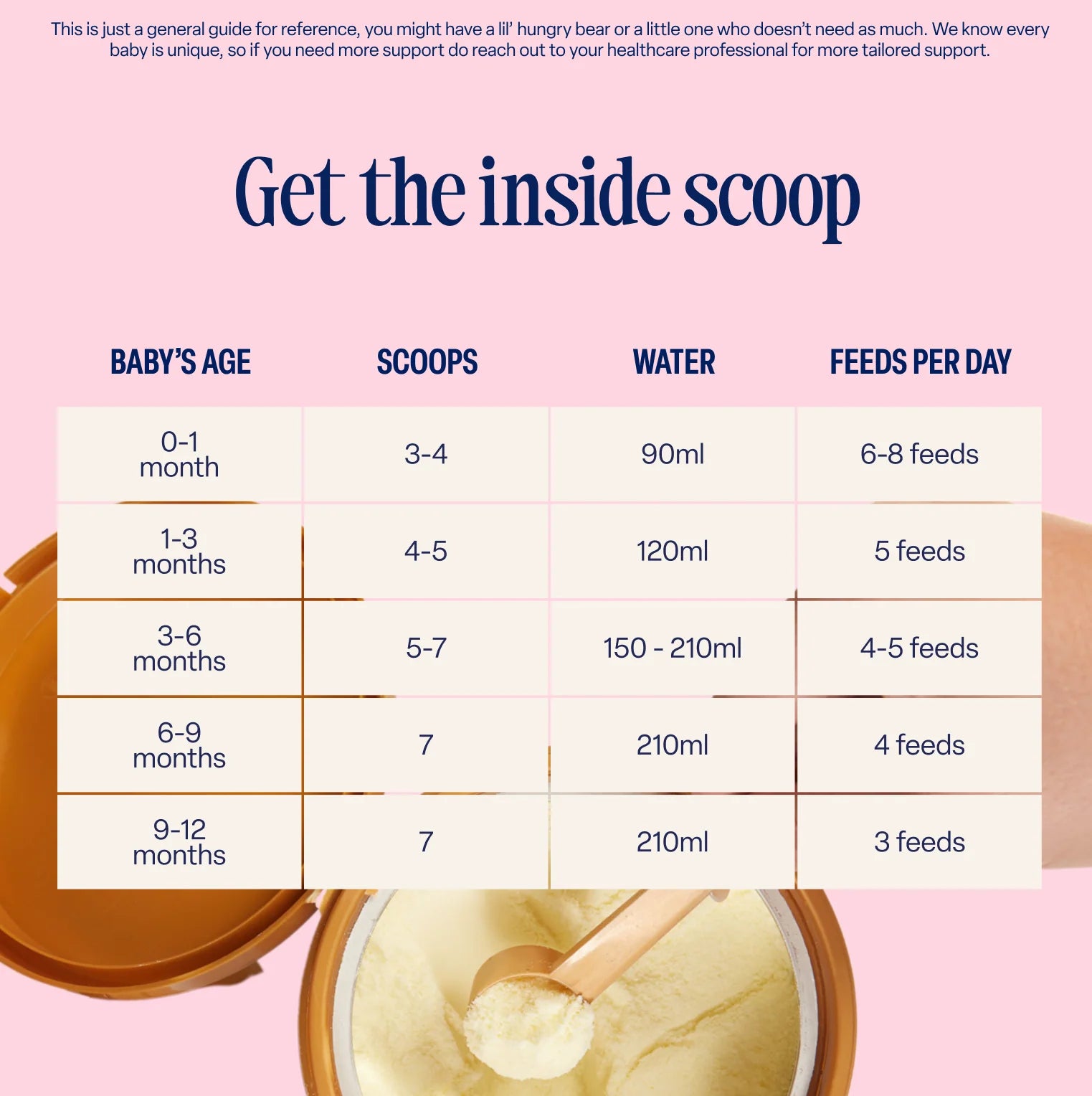 For feeding your baby, add 1 level scoop of powder to each 30 ml of water (freshly boiled and cooled). Please refer to the feeding guide shown on the can. All babies are different and may require more or less than is shown. Kendamil First Infant Milk should be fed on demand. If you need more advice talk to your healthcare professional.
