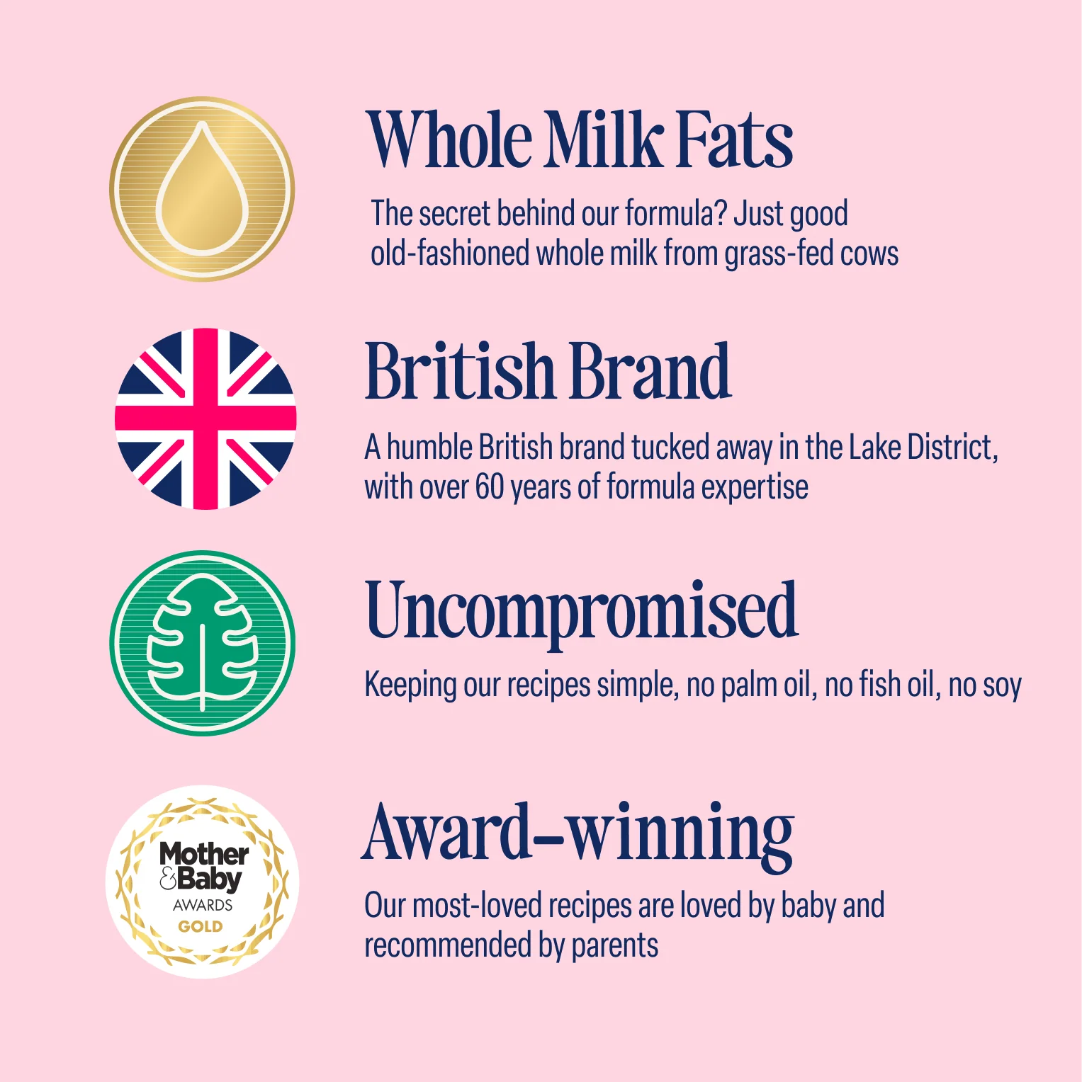 Whole Milk, Skimmed Milk, Lactose (Milk), Vegetable Oils (Sunflower, Coconut, Rapeseed), Demineralised Whey Powder (Milk), Galacto oligosaccharides (Milk), Whey Protein Concentrate alpha-lactalbumin (Milk), Less than 2% of: Calcium Citrate, Potassium Chloride, Calcium Phosphate, Sodium Citrate, Choline Bitartrate, Fructo - oligosaccharides, Magnesium Chloride, Oil from the microalgae Schizochytrium sp., Sodium Ascorbate (Vitamin C), Potassium Hydroxide, Inositol, L-Tyrosine, Oil from Mortierella alpina, Taurine, Iron Pyrophosphate, Nucleotides (Cytidine-5’-monophosphate, disodium Uridine-5’-monophosphate, Adenosine- 5’-monophosphate, disodium Inosine-5’-monophosphate, disodium Guanosine-5’ monophosphate), L-Phenylalanine, Zinc Sulphate, Vitamin E, Niacin, Calcium Pantothenate, Copper Sulphate, Thiamin, Riboflavin, Vitamin A, Vitamin B6, Manganese Sulphate, Folic Acid, Potassium Iodide, Sodium Selenite, Vitamin K, Vitamin D3, Biotin, Vitamin B12. Antioxidant: Tocopherol-Rich extract