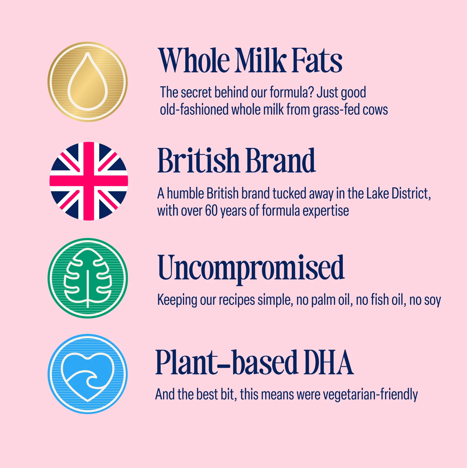 Water, whole milk, demineralised whey (milk), demineralised whey permeate (milk), vegetable oils (rapeseed oil, sunflower oil), galacto-oligosaccharides (milk), fructo-oligosaccharides, oil from Crypthecodinium cohnii, oil from Mortierella alpina, L-tryptophan, L-tyrosine, inositol, L-carnitine, choline chloride, taurine, minerals: sodium citrate, calcium phosphate, potassium phosphate, sodium chloride, magnesium chloride, ferrous sulphate, zinc sulphate, copper sulphate, manganese sulphate, sodium selenite, potassium iodide, potassium hydroxide, vitamins: A, D3, B1, B2, niacin, pantothenic acid, B6, biotin, folic acid, B12, C, E, K1, emulsifier: sunflower lecithin, antioxidant: tocopherol rich extract.