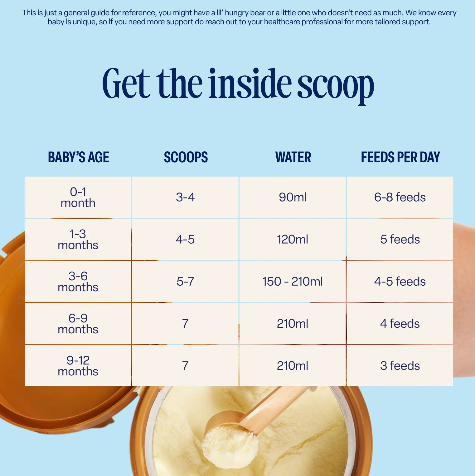 For feeding your baby, add 1 level scoop of powder to each 30 ml of water (freshly boiled and cooled). All babies are different and may require more or less than is shown. Kendamil Follow On Milk should be fed on demand. If you need more advice talk to your healthcare professional.