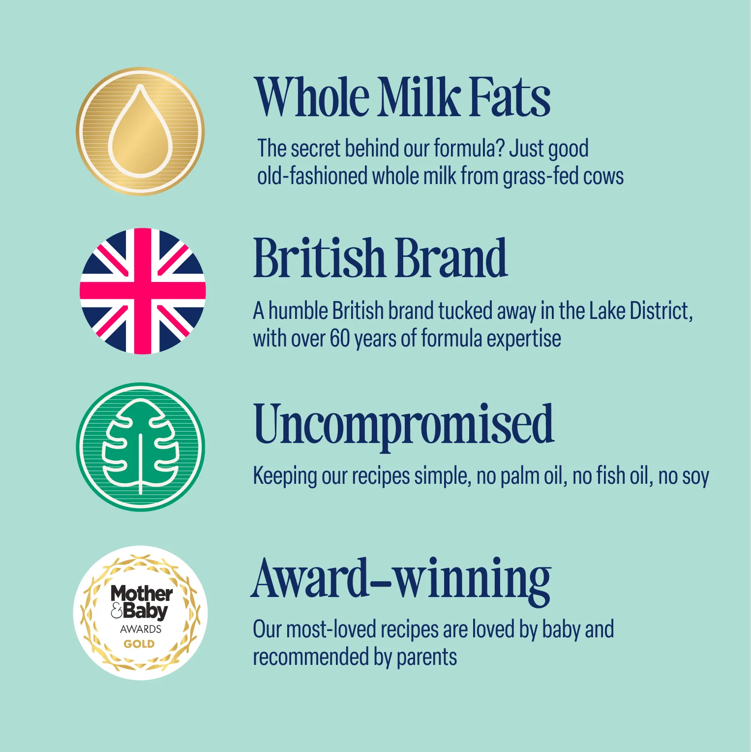 Whole Milk, Skimmed Milk, Lactose (from Milk), Vegetable Oils (Sunflower, Coconut, Rapeseed), Galacto-oligosaccharides (Milk), Less than 2% of: Calcium Phosphate, Potassium Hydroxide, Oil from the Microalgae Schizochytrium sp., Oil from Mortierella Alpina, Sodium Ascorbate, Fructo- oligosaccharides, Calcium Citrate, Iron Pyrophosphate, Nucleotides (cytidine-5'-monophosphate, disodium uridine-5’-monophosphate, adenosine-5'-monophosphate, disodium inosine-5'-monophosphate, disodium guanosine-5'-monophosphate), Vitamin E, Zinc Sulphate, Niacin, Calcium Pantothenate, Copper Sulphate, Vitamin A, Thiamin, Riboflavin, Vitamin B6, Folic Acid, Manganese Sulphate, Potassium Iodide, Vitamin K, Sodium Selenite, Biotin, Vitamin D3, Vitamin B12, Antioxidant: Tocopherol-Rich