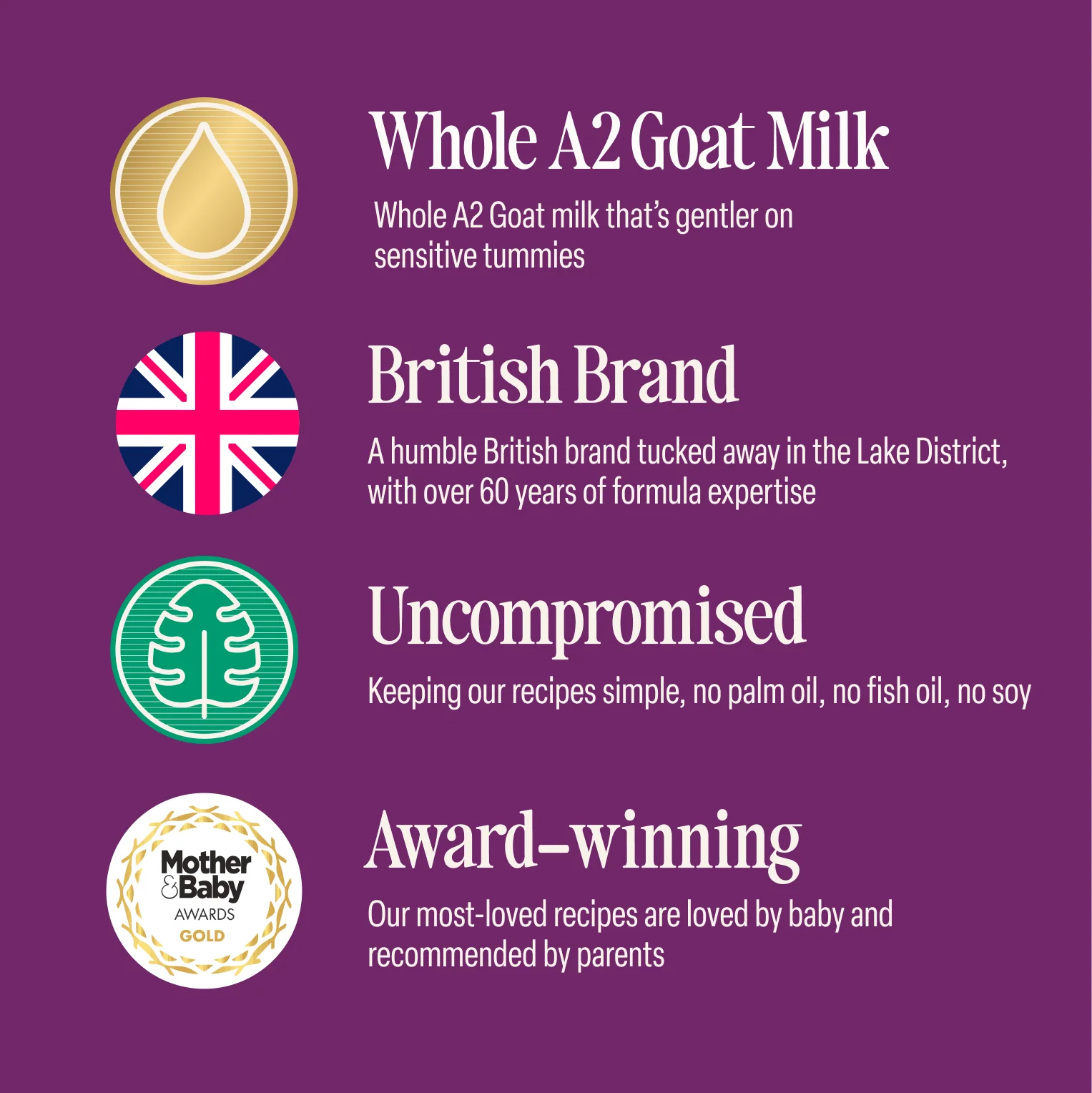 Whole goat milk, Demineralised goat whey powder (from milk), Vegetable oils (Sunflower, Coconut, Rapeseed), Galacto-oligosaccharides (from milk), Lactose (from milk), Calcium citrate, Choline bitartrate, Potassium chloride, Calcium lactate, Sodium citrate, Magnesium chloride, Sodium ascorbate, Oil from the microalgae Schizochytrium sp. (milk), L-Tyrosine, L-Phenylalanine, L-Tryptophan, Potassium hydroxide, Inositol, Oil from Mortierella alpina (milk), L-Isoleucine, Taurine, Calcium phosphate, Ferrous sulphate, Nucleotides (Cytidine-5’-monophosphate, disodium Uridine-5’-monophosphate, Adensine-5’-monophosphate, disodium Inosine-5’-monophosphate, disodium Guanosine- 5’-monophosphate), L-Carnitine, Zinc sulphate, Vitamin E, Niacin, Calcium pantothenate, Copper sulphate, Thiamin, Riboflavin, Vitamin A, Vitamin B6, Manganese sulphate, Folic acid, Potassium iodide, Sodium selenite, Vitamin K, Vitamin D3, Biotin, Vitamin B12.