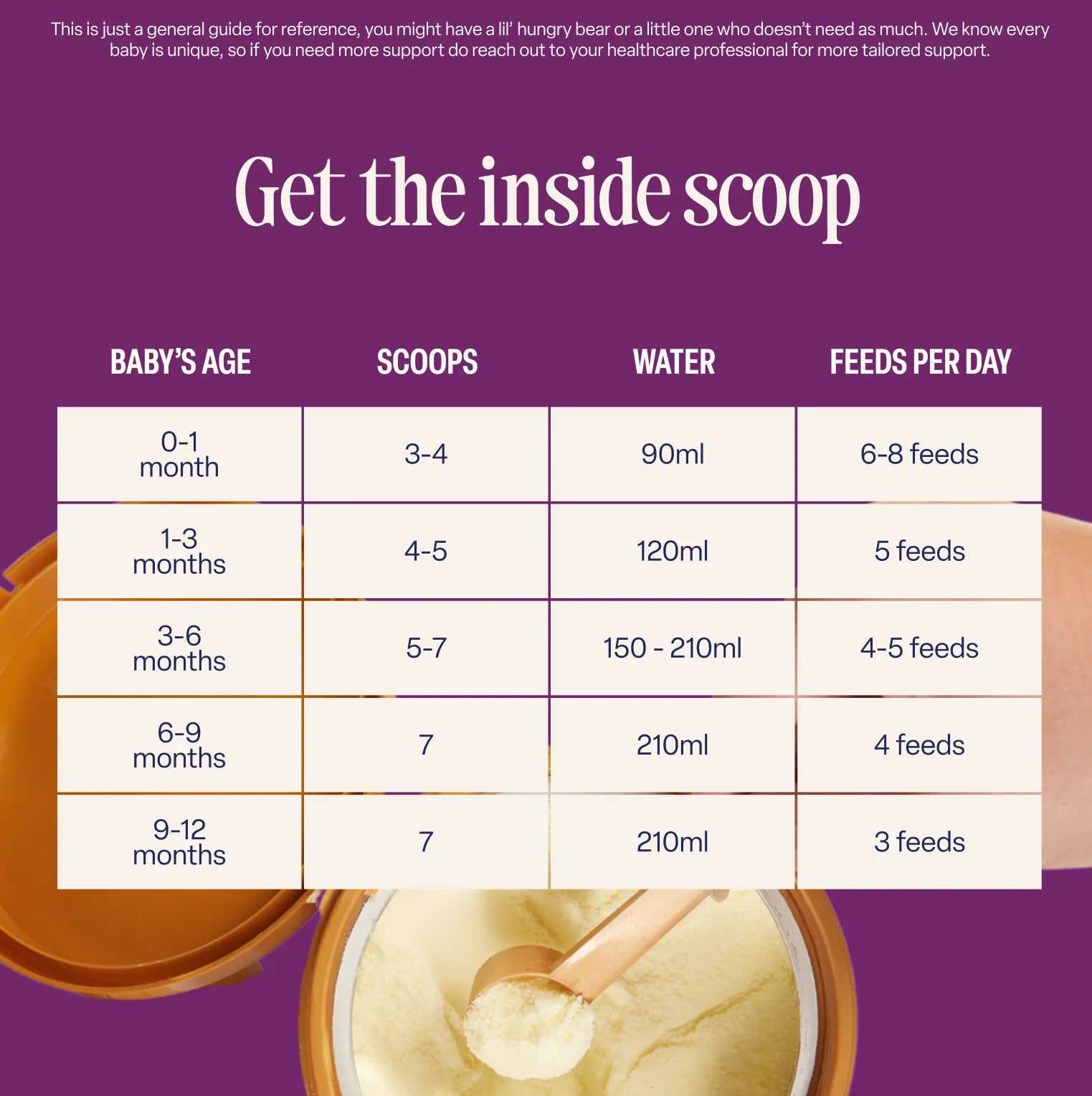 For feeding your baby, add 1 level scoop of powder to each 30 ml of water (freshly boiled and cooled). All babies are different and may require more or less than is shown. Kendamil Goat Follow On Milk should be fed on demand. If you need more advice talk to your healthcare professional.